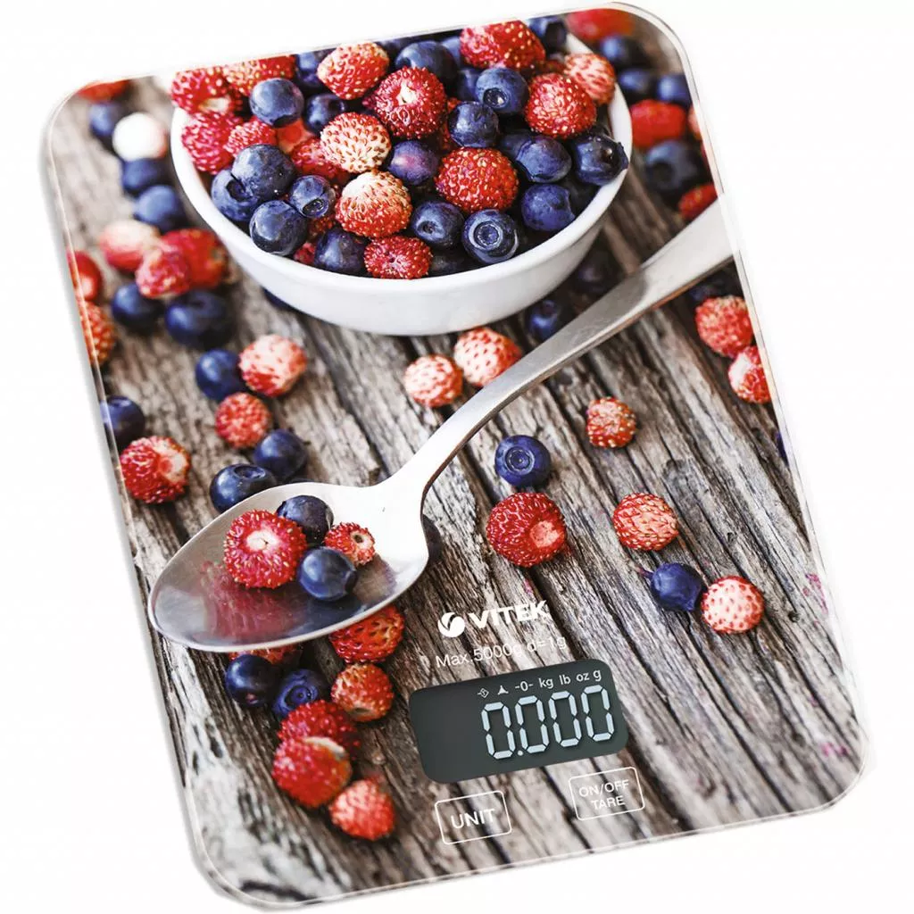 Весы Vitek VT-8000 представляют собой сверхлегкий плоский пластиковый корпус с идеально ровной, гладкой поверхностью. Поверх стеклянной платформы нанесена сочная, аппетитная фотография с изображением свежих летних ягод. Аккуратное оформление как нельзя лучше подходит для кухонного интерьера, вызывая желание как можно чаще обращаться за помощью к полезному прибору. Конструктивное решение аппарата дает возможность использовать при взвешивании любую посуду, что особенно удобно при измерении больших объемов продуктов.