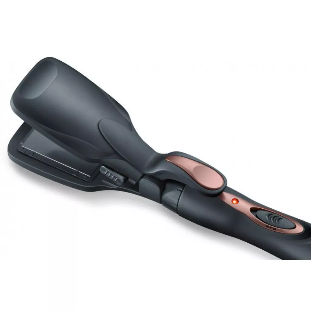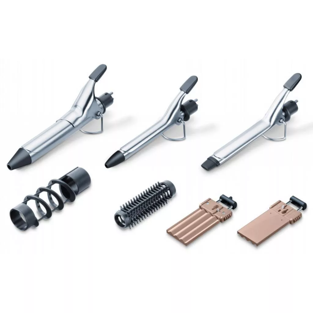 Стайлер Beurer CHC 40 относится к моделям многофункционального назначения – он отлично справится и с выравниванием волос и с их завиванием. Причем последняя операция осуществляется в самых разнообразных вариантах локонов или гофре. Эргономичный корпус отлично спроектирован, имеет стильный внешний вид, прочен на износ. Дизайн базируется на классическом сочетании черного цвета и бронзы. Фактура поверхности матовая.
