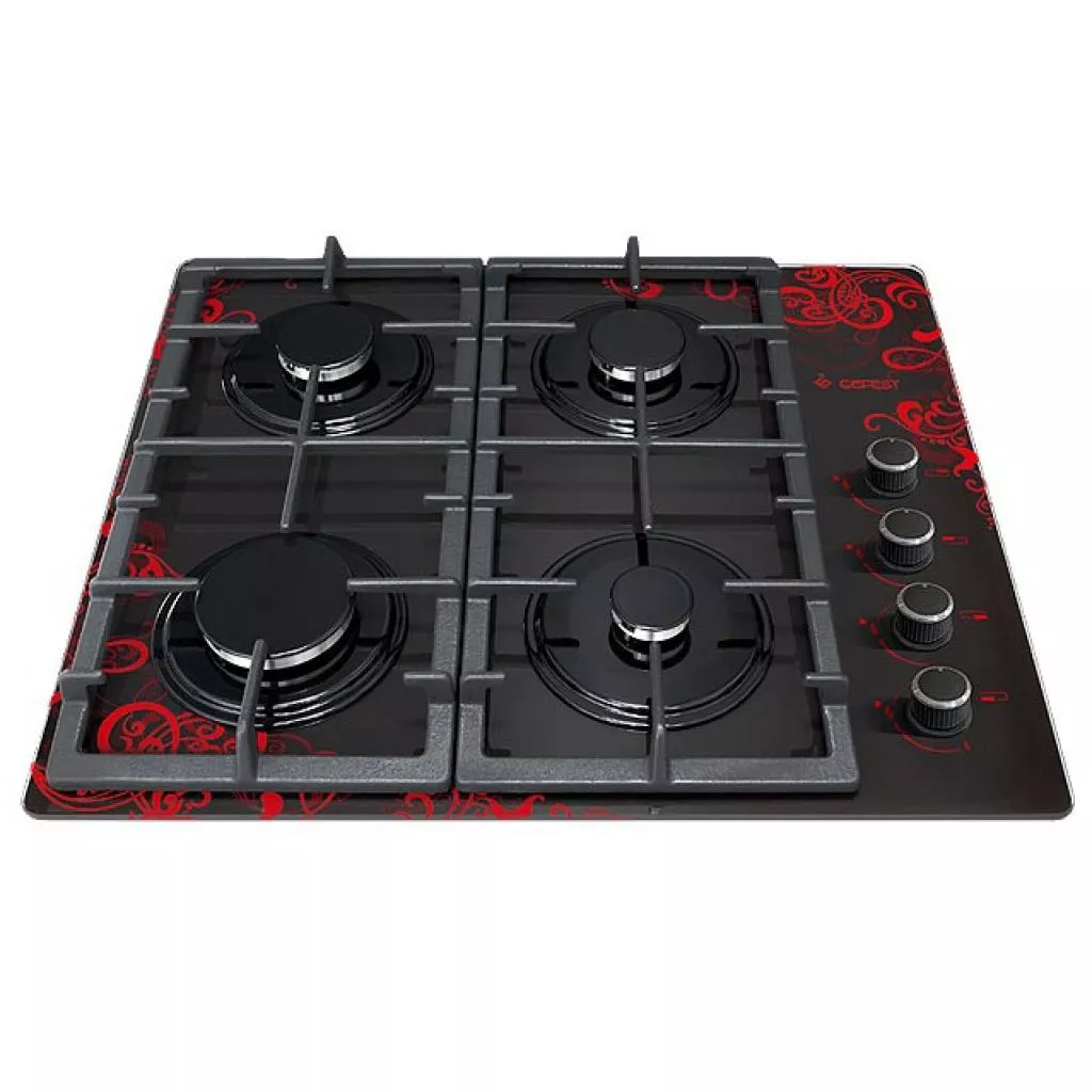 Для приготовления блюд хозяйка получает в свое распоряжение 4 газовые конфорки с разной мощностью пламени, которые регулируются поворотными ручками, расположенными в боковой части варочной панели. Размеры у конфорок тоже разные, поэтому вы сможете выбрать наиболее подходящую к вашей посуде. Размещение конфорок классическое – такая конструкция дает возможность максимально и в полном объеме удобно поместить сковородки и кастрюли. На поверхности установлены две раздельные устойчивые чугунные решетки для кастрюль, которые способны надежно удержать различную посуду. Конфорки расположены на стеклянной панели черного цвета с оригинальным орнаментом. Термостойкая панель обладает необходимой прочностью, за ней легко ухаживать, а ее внешний вид устройства порадует хозяйку и украсит кухню.