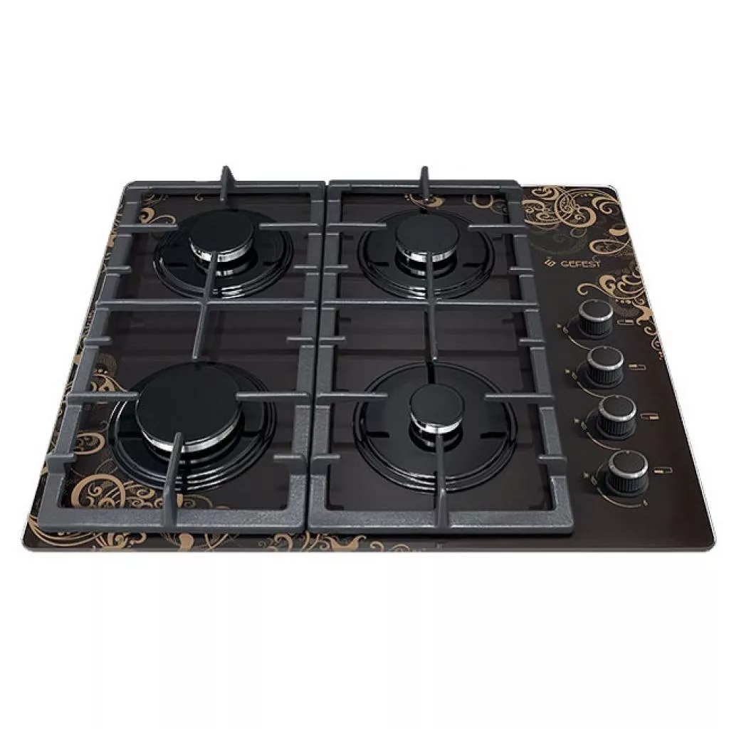 Размещение конфорок классическое – такая конструкция дает возможность максимально и в полном объеме удобно поместить сковородки и кастрюли. На поверхности установлены две раздельные устойчивые чугунные решетки для кастрюль, которые способны надежно удержать различную посуду. Конфорки расположены на стеклянной панели черного цвета с оригинальным орнаментом. Термостойкая панель обладает необходимой прочностью, за ней легко ухаживать, а ее внешний вид устройства порадует хозяйку и облагородит кухню.