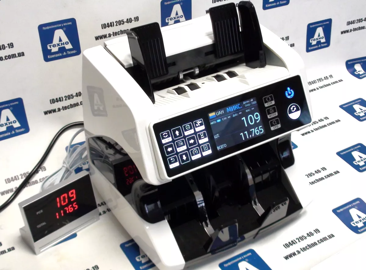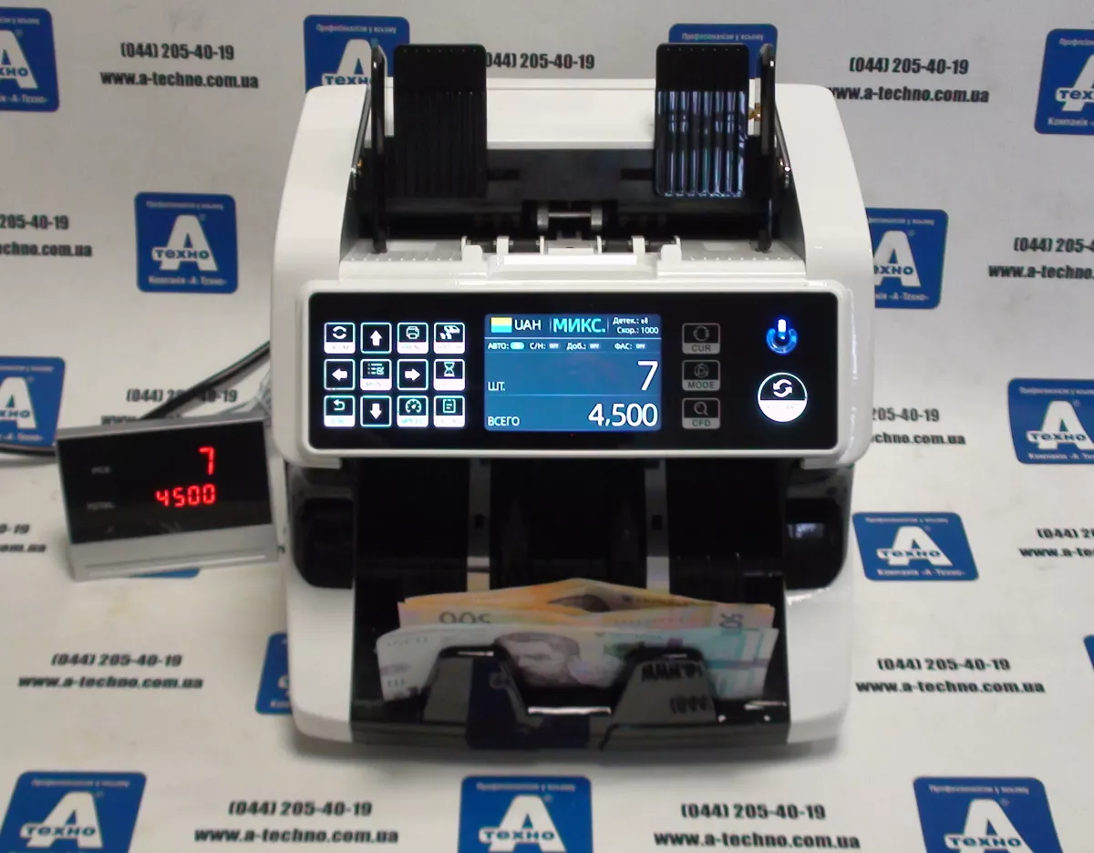 Счетчик банкнот, купюр BCASH MVC500 с определением номинала. Купюросчетная машинка с возможностью пересчета смешанной пачки и определения номинала купюр. Адаптирована под новые 1000 грн, 200, 50, а также 500, 100, 20 грн. Оснащен двумя улучшенными CIS сканерами и возможность проверки банкнот по УФ, магнитным (5 датчиков), ИК меткам. Детекция по размеру (3D сканирование) и по плотности банкнот. Используется два высокоточных CIS сканера. Емкость загрузочного кармана - 500 банкнот, накопителя 300 банкнот. Скорость пересчета регулируемая - 800/1000/1200 банкнот в минуту. Пересчет смешанной пачки Долларов, Евро, Гривен, Фунтов, Франков, Польских злотых, Канадских долларов. Автоматическое определение валюты. Важно - оригинальная модель способна проверять до 7 валют! Наличие проверки 10 валют говорит о не оригинальном устройстве. Дополнительным признаком подлинности устройства является наличие голографической наклейки с надписью BCASH (другие надписи свидетельсвуют о не оригинальном счетчике, некоторые продавцы выдают похожие модели за BCASH MVC500 по существенно более низкой цене). Габариты 280х260х270 мм. Вес 6.7 кг