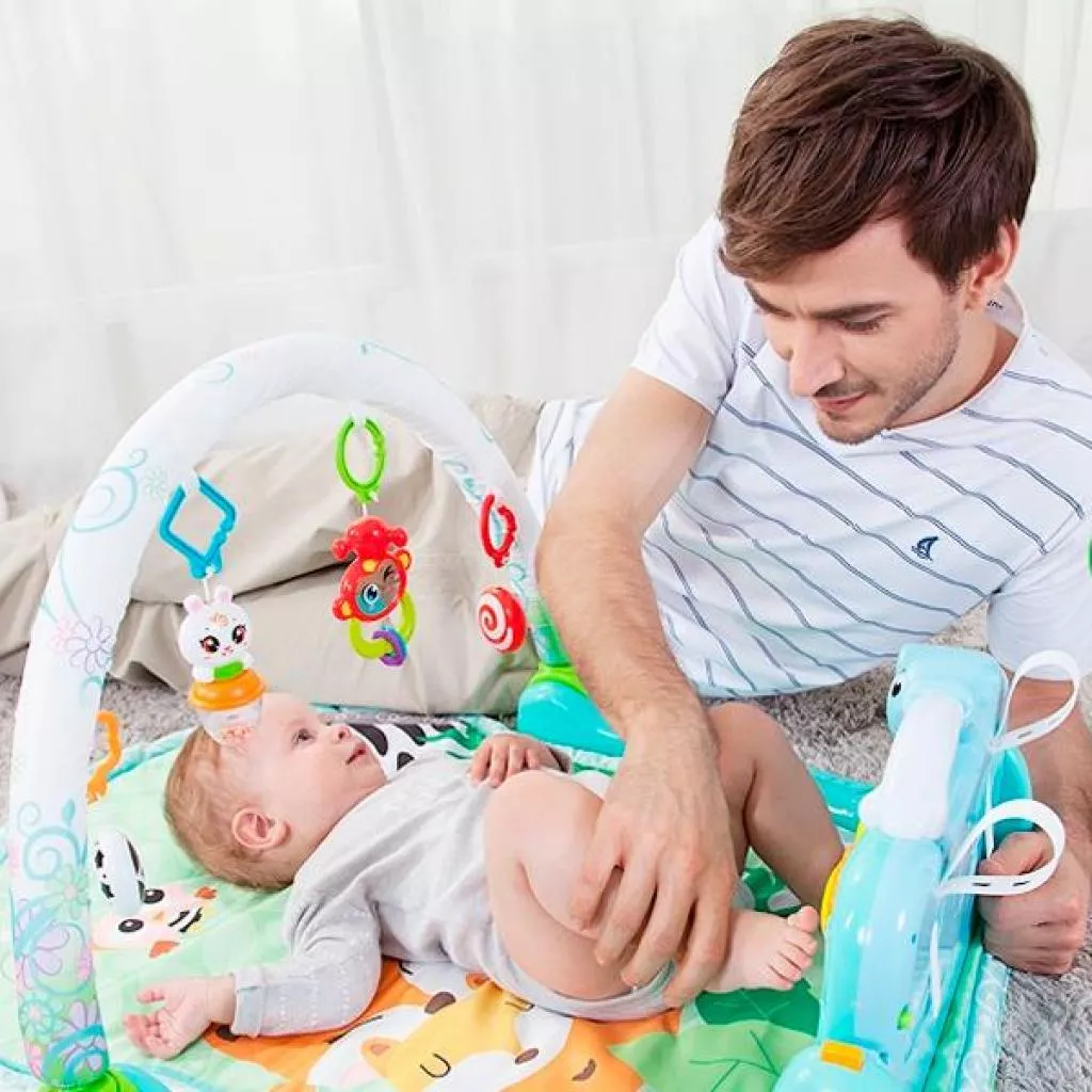 гимнастический центр, музыкальный центр, от рождения, моторика рук, координация движений, зрительная фиксация на предметах, музыкальный слух, Мягкий коврик, съемная игровая музыкальная панель, светящаяся дуга, 4 съемных погремушки,