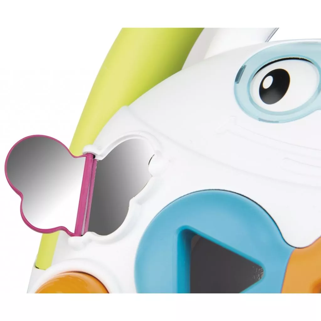Ребенок сразу заинтересуется цветными элементами, которые имеют разнообразные функции. Дети развивают слух, внимание, мелкую моторику и учатся распознавать формы и цвета. Во время игры с сортером ребенок учится подбирать соответствующую фигуру к определенному отверстия, если все получилось, звучит звук и загорается свет. Дети любят, когда все получается и пытается это повторить, снова и снова. Все элементы, которые попали в сортер, легко получить, только нужно повернуть ключ, и дверь откроется. Игровая панель отсоединяется, а благодаря удобной ручке ее можно брать с собой. Игровой центр выполнен в приятных цветах, специально подобранных в соответствии с возрастными особенностями развития зрения малыша.