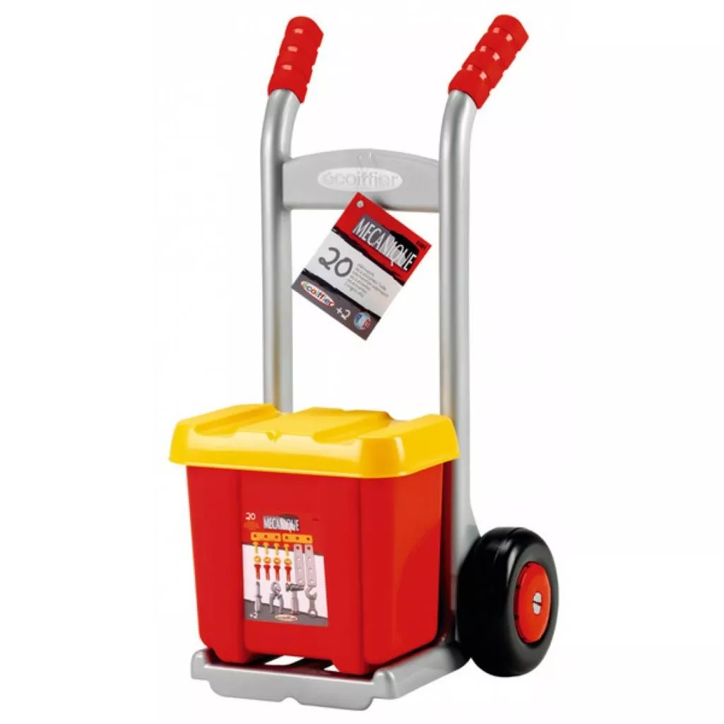 Удобная тележка на двух колесах с чемоданом. Имеет в чемодане 20 аксессуаров: отвертку, гаечный ключ, тиски, молоток и гвозди с болтами и гайками.