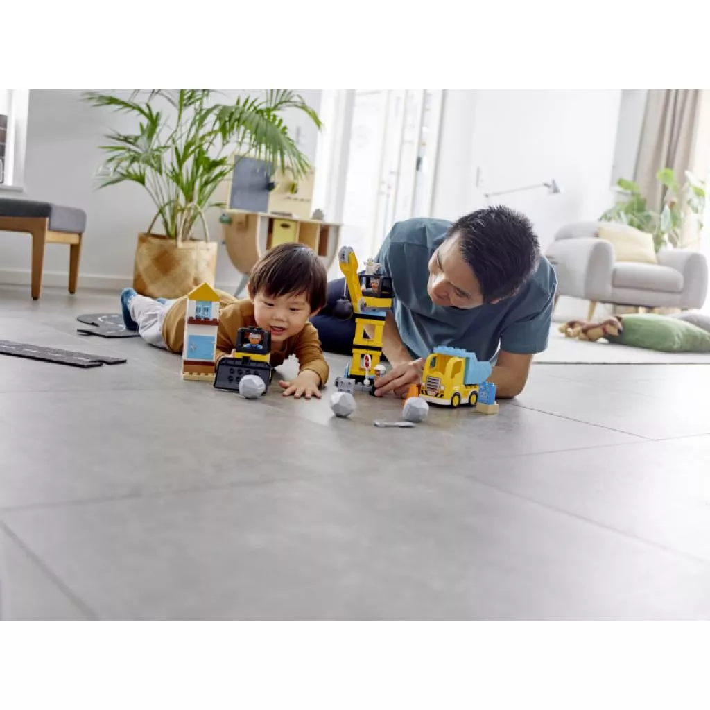 Родители и дети смогут работать в команде: раскачивать шаровой таран, чтобы снести маленький домик, убирать строительный мусор бульдозером и доставлять новые строительные материалы в кузове самосвала. Исследуя возможности для игр, предоставляемые этим набором, дети будут развивать важнейшие физические и умственные способности, необходимые для дальнейшей жизни.