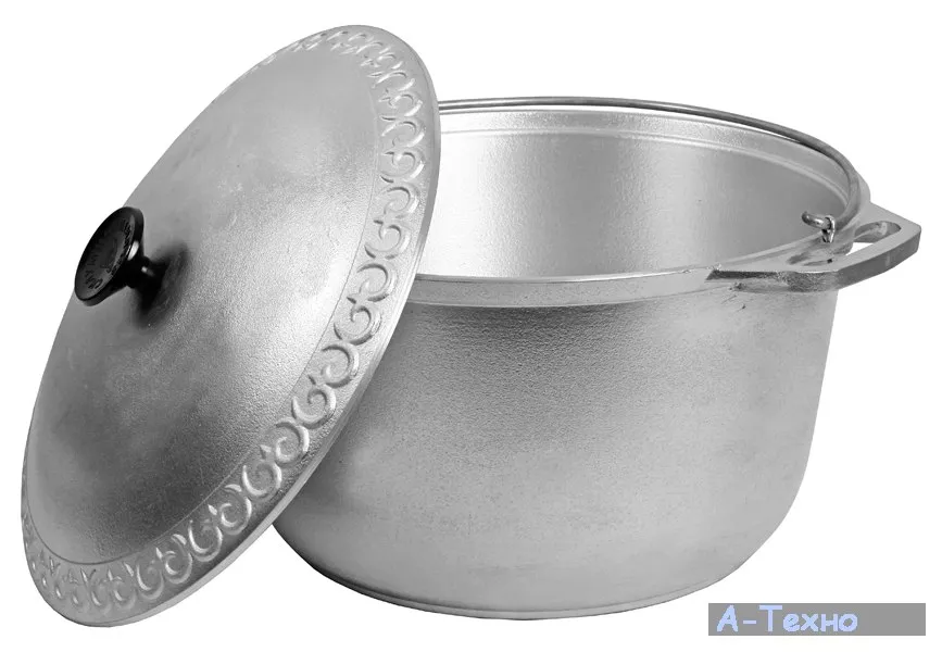 Особенности: алюминиевый литой казан без покрытия; утолщенные стенки; имеет металлическую дужку для костра; снабжен крышкой с жаростойкой ручкой.