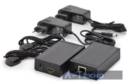Удлинитель DIGITUS HDMI - состоит из экстендера HDMI, передающего и принимающего модуль, приёмного ИК-устройства и 2-х сетевых блоков питания 5 В, 2 А.