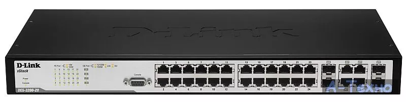 Сетевой комутатор D-Link DES-3200-28 - управляемый коммутатор 2 уровня с 24 портами 10/100BASE-TХ + 4 комбо-портами 1000Base-T/SFP.