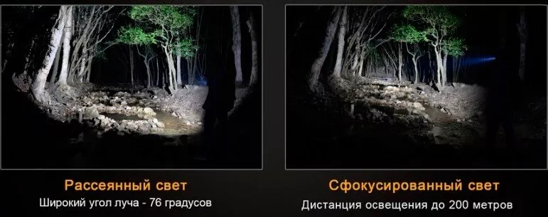 Эта функция позволяет использовать один и тот же фонарь для освещения близлежащей местности заливным светом широкого луча, или же увеличивать дальность, делая луч более узким.
