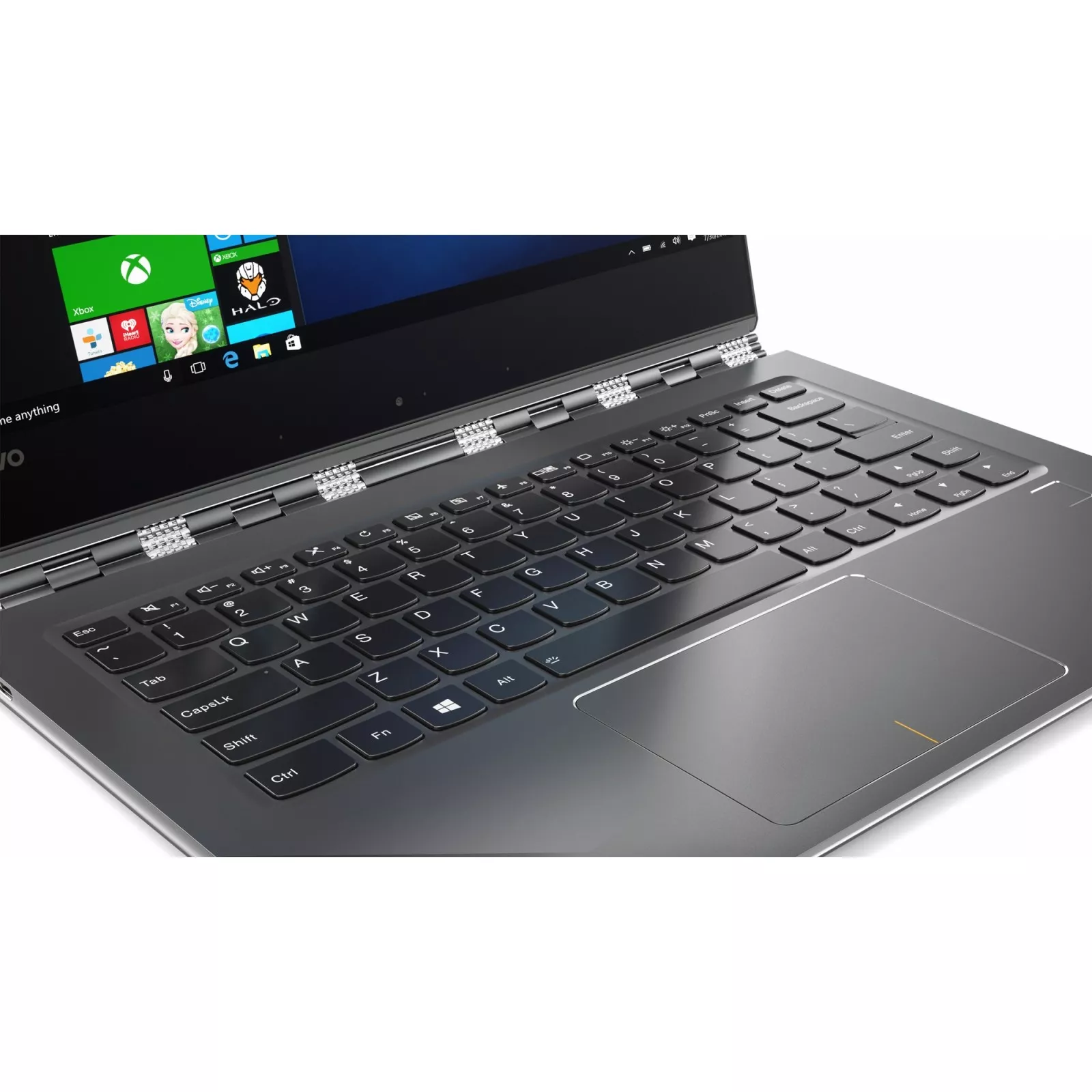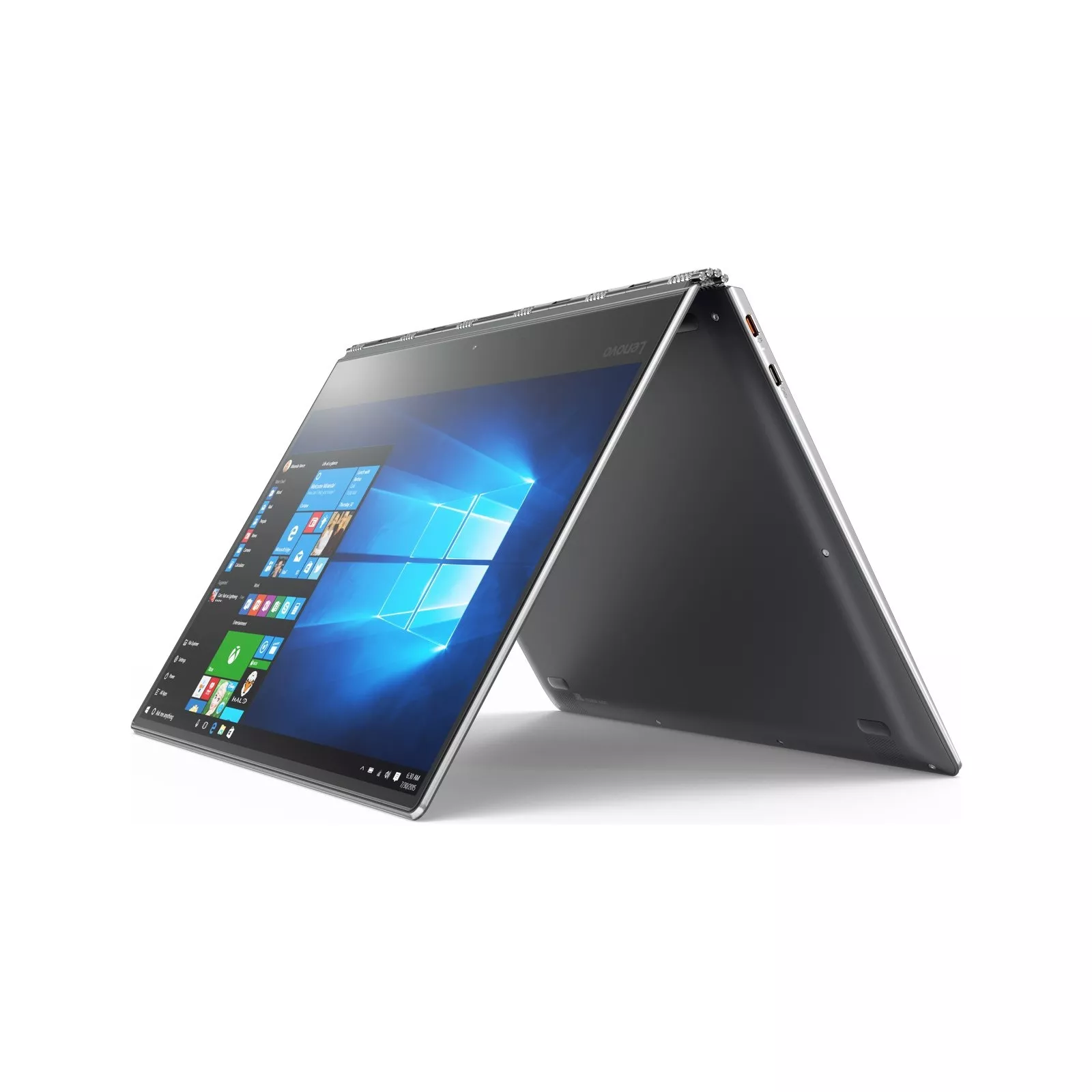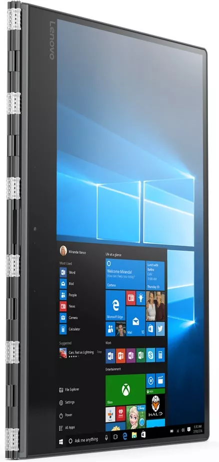 Тщательно обработанная поворотная конструкция по типу часового браслета не только впечатляюще выглядит, но и практична в работе. Мастерски отрегулированная, она позволяет плавно открыть ноутбук. Конструкция к тому же достаточно устойчивая, чтобы удерживать сенсорный экран в удобном положении для просмотра. Независимо от способа использования — в качестве планшета или ноутбука — Yoga 910 отлично выглядит и удобен в работе.