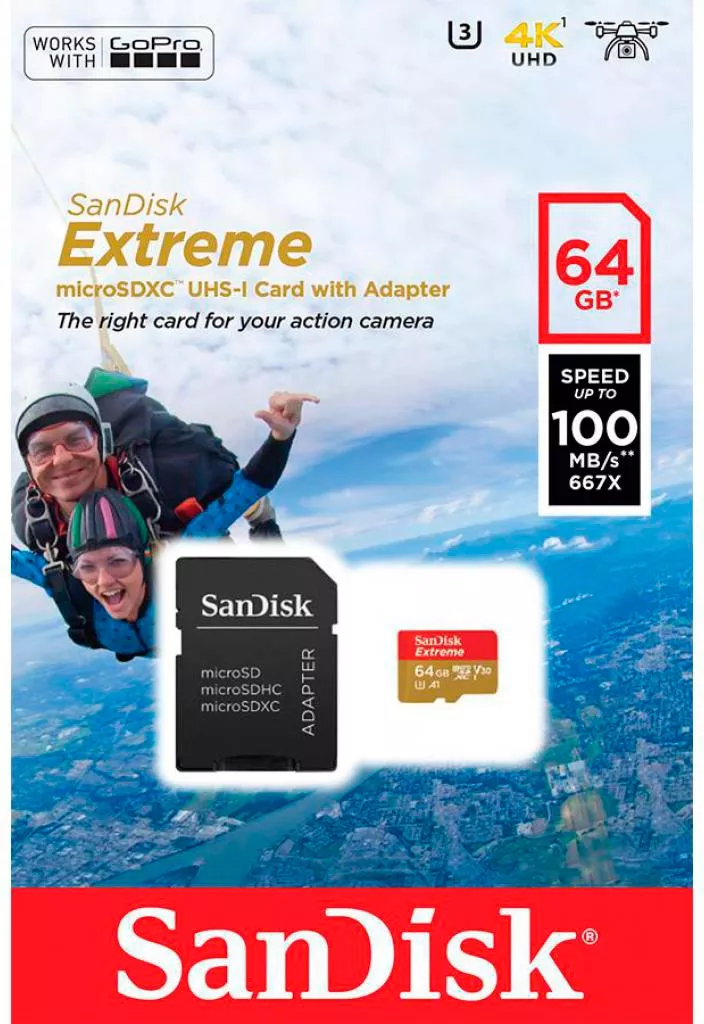 Снимайте еще больше приключений, записывайте больше видео в форматах Full HD или 4K Ultra HD1 на вашем смартфоне Android™, планшете или беззеркальной камере со сменной оптикой. Карты памяти SanDisk Extreme отличаются повышенной прочностью и высокой надежностью в самых жестких условиях. Благодаря высокой скорости записи снижается время, необходимое для переноса фотографий и видео на карту памяти или с карты памяти на компьютер. Емкость от 16 до 128 ГБ дает возможность расширить память устройства и записывать видео высокого качества в формате, пригодном для демонстрации на новых телевизионных экранах и мониторах с разрешением 4K Ultra HD.