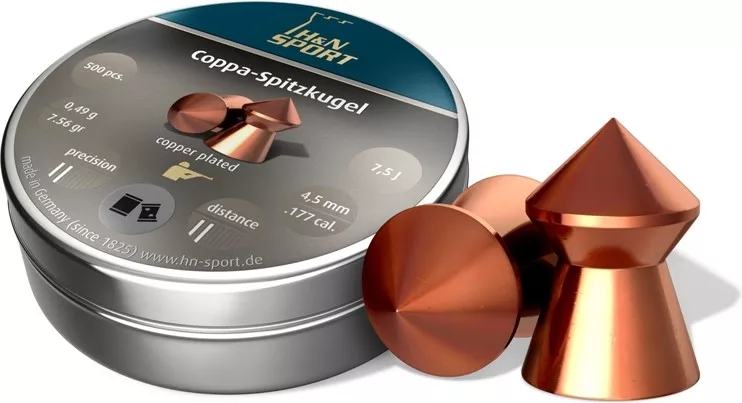 Конструкция пули обеспечивает неплохую точность на средних дистанциях, а медный корпус на 20% повышает проникающую способность. Рекомендуемая дульная энергия – 7,5-16 Дж. Оптимальная область применения – до 25 м.