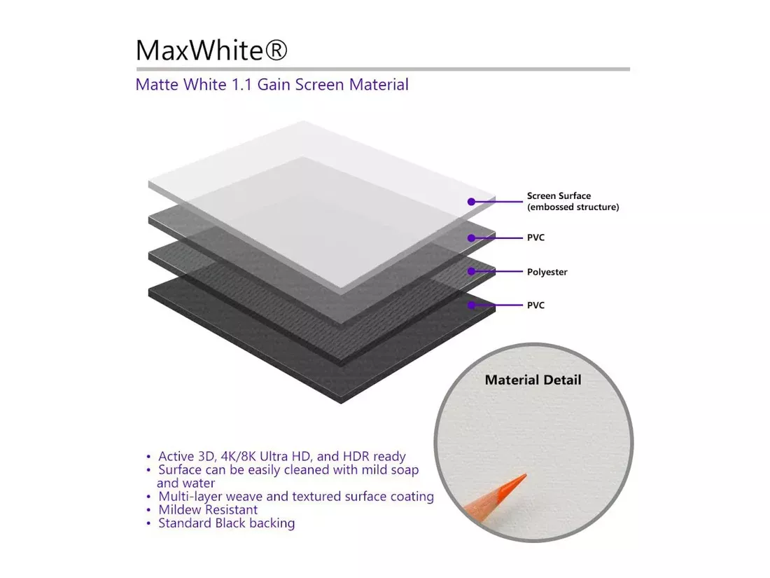 - материал экрана MaxWhite - долговечный и легкомоющийся, защищен от быстрого воспламенения.