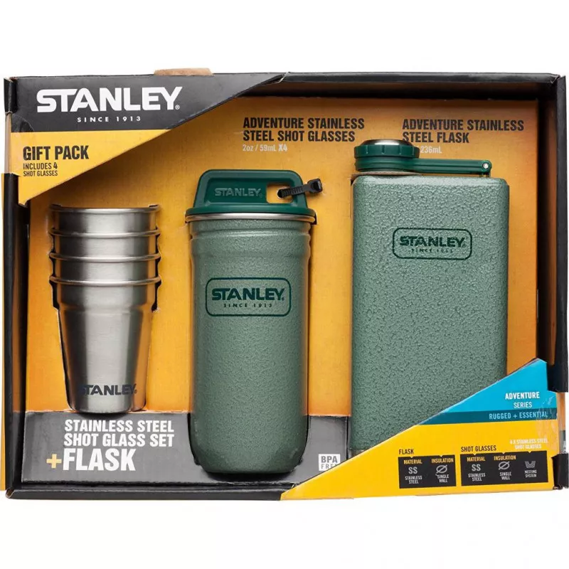 Набор от Stanley серии Adventure состоит из стального футляра и четырех рюмок из нержавеющей пищевой стали. Футляр надежно закрывается винтовой крышкой, выполнен в зеленом цвете с покрытием Hammertone.