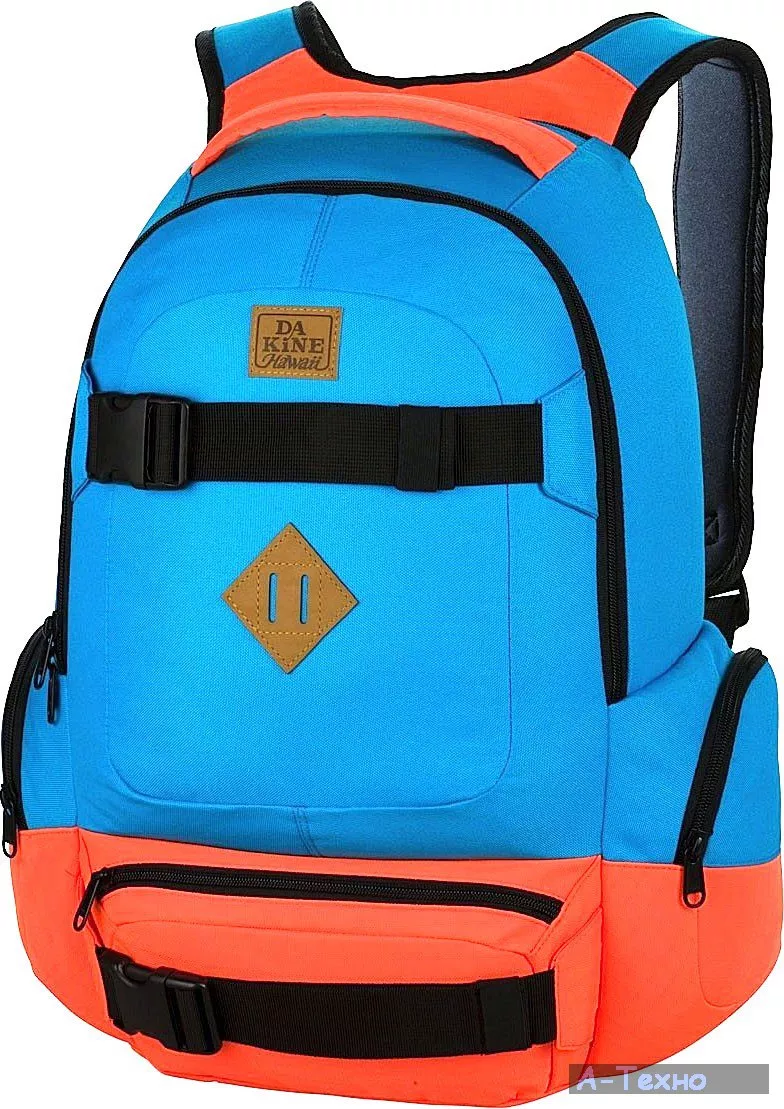 Данная модель выполнена из уникальной прорезиненной ткани, которая быстро высыхает, великолепно сохраняет форму, устойчива к световому и тепловому воздействию, не промокает и проста в уходе. Рюкзак имеет большое отделение на молнии, в которое способно вместится масса полезных и нужных в путешествии вещей и предметов. Модель DAKINE Daytripper имеет карман с мягкой противоударной вставкой для большинства ноутбуков 15". В нижней части рюкзака небольшое отделение на молнии для предметов первой необходимости. Боковые карманы на молниях. Эластичные ремни с пластмассовыми карабинами-застежками для фиксации скейта вверху и внизу. Удобная мягкая ручка для переноски рюкзака. Анатомическая спинка. Широкие регулируемые лямки.