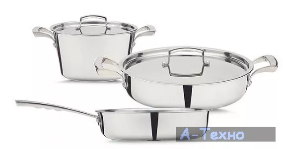 Поймут-ли хозяйки (это больше для мужей), но все ручки крепятся на прочные шурупы. Это значит, что в процессе эксплуатации ручки не будут разбалтываться (в крайнем случае их легко прижать шурупами). Если обратите внимание - у дешевой посуды часто это заклепки, то есть через какое-то время ручки будут неисправимо болтаться.