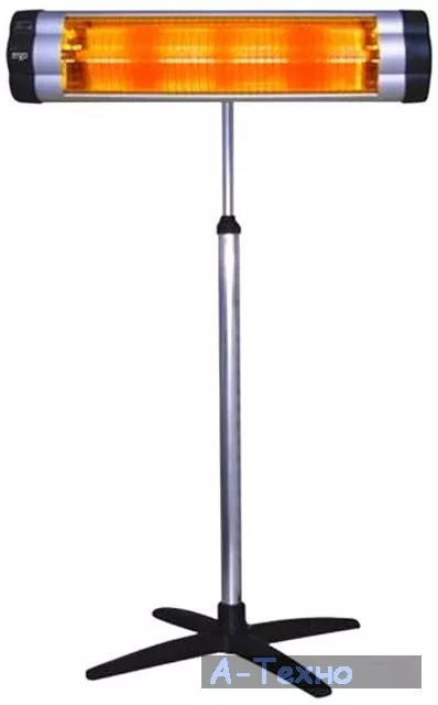 Инфракрасный обогреватель Ergo HI 1618 работает от электросети. Максимальная мощность составляет 1800 Вт. Нагревательный элемент – кварцевая лампа. Данный прибор может быть установлен как на стене, потолке, так и размещен на телескопической ноге, которая позволит легко перемещать обогреватель и разворачивать в нужном направлении. Стойка регулируется по высоте от 1,1 до 1,75 м. Все необходимое для монтажа идет в комплекте к прибору.