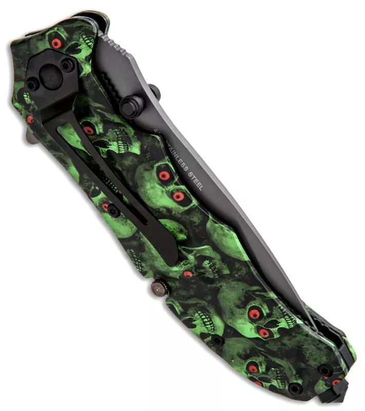 Нож Boker Magnum Hades Rescue отличается оригинальным дизайном: на рукоять нанесены изображения зеленых черепов со светящимися красными глазами.