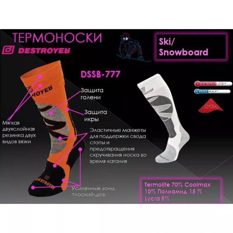 Носки Destroyer Ski / Snowboard DSS -777 из комбинированного волокна на основе полиэстра, способны впитывать и выводить пот, обеспечивать теплоизоляцию и устойчивость к механическим воздействиям, а также эластичны и экологически безвредны. Обладают высокими термоизоляционными свойствами даже в условиях влажной среды. Позволяют использовать их в суровый зимний период во время катания на лыжах или сноуборде.