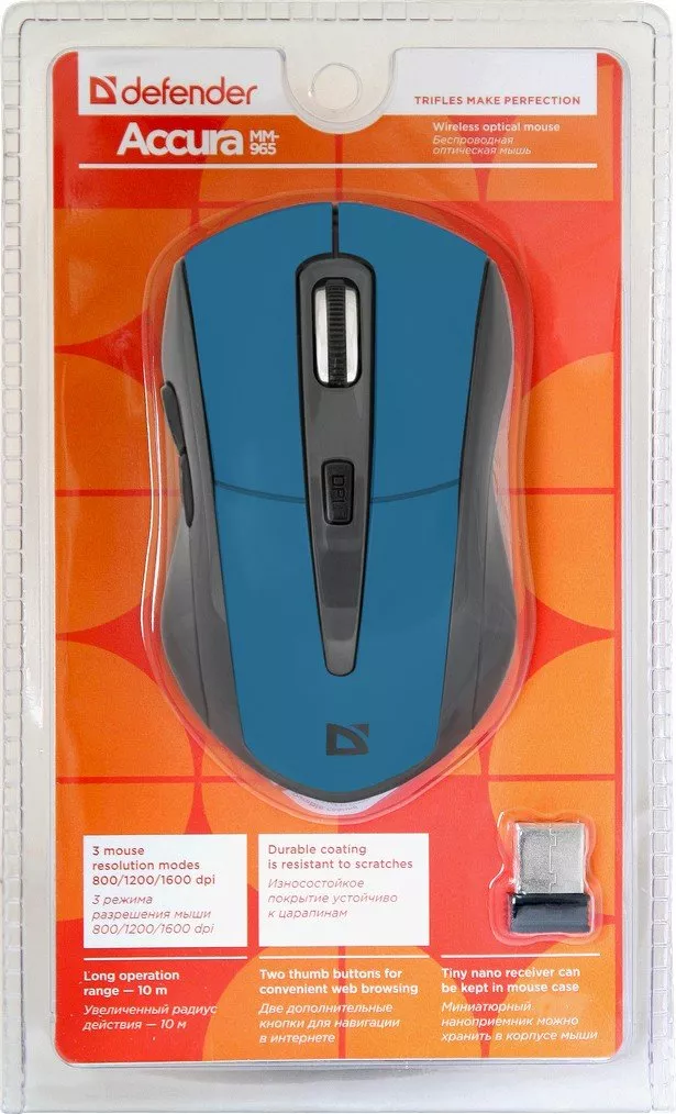 Defender Accura - классическая беспроводная мышка для работы в офисе или дома. Имеет компактные габариты, легко помещается в сумку вместе с другими аксессуарами для ноутбука. Ее можно будет брать с собой на работу или в университет, корпус имеет достаточную прочность, чтобы не бояться частых переносов.