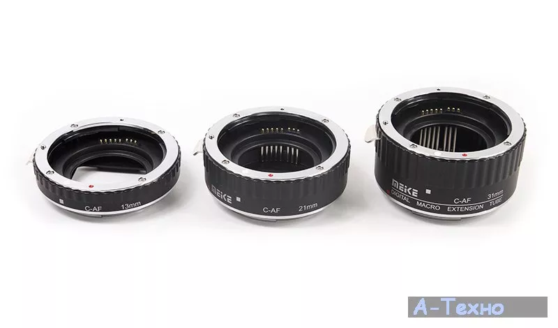 Автофокусные макрокольца Meike MK-C-AF1-А для Canon (AF-макрокольца, удлинительные кольца) устанавливаются между камерой и объективом и позволяют сократить фокусное расстояние, что, в свою очередь, позволяет снимать объекты на коротких расстояниях в увеличенном масштабе (т.н. макросъемка). Достоинством колец является то, что они заменяют очень дорогие макрообъективы. Совместимы с байонетом Canon EF и EF-S. Макрокольца не содержат оптических элементов и не влияют на качество итоговых фотографий. Макрокольца имеют сквозные контакты, что дает возможность управлять диафрагмой и сохраняет функцию автофокуса. Комплект содержит три кольца (13 мм, 21мм и 31 мм). Есть возможность комбинирования, которая даст следующие варианты: 13 мм, 21 мм, 31 мм, 34 мм, 44 мм, 52 мм, 65 мм. Эти варианты будут давать самые разнообразное масштабирование при макросъемке. Макрокольца будут работать со всеми камерами, имеющими байонет Canon EF (EF-S).