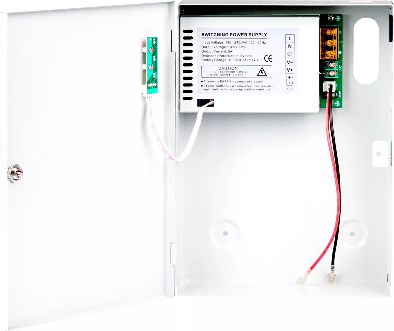 Источник бесперебойного питания GreenVision GV-002-UPS-A-1201-5A (5457) защищен от коротких замыканий и от перегрузок по току. Он выполнен в металлическом корпусе с дверкой. Корпус окрашен в белый цвет и имеет три светоиндикатора для индикации режимов работы. Имеется свободное место для установки и подключения АКБ емкостью до 7Ah. Данное устройство имеет такие технические характеристики: входное напряжение 100-240 вольт переменного тока, выходное напряжение 12 вольт, общий выходной ток 5 ампер, частота сети 50-60 Гц.