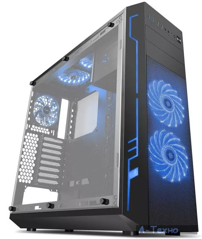 Данная модель корпуса позволит сконструировать неплохой геймерский компьютер: система вентиляции с вентиляционными решётками обеспечивает нормальный температурный режим даже при полной загрузке. У корпуса есть особый акриловый тюнинг боковой панели – она прозрачна, поэтому пользователь может увидеть, как работает «начинка» корпуса. Предустановленные кулеры имеют подсветку для лучшего обзора и просто эстетичного вида конструкции. Место для блока питания находится на дне самого корпуса, это помогает погасить вибрацию и сделать уровень шума ниже даже при полной нагрузке. На корпусе расположены кнопки управления питанием и загрузкой системы, а также входы для наушников, USB-порты и входы для микрофона. Максимально допустимый размер карт для установки – до 465 мм, максимально приемлемая высота кулеров – 179 мм.