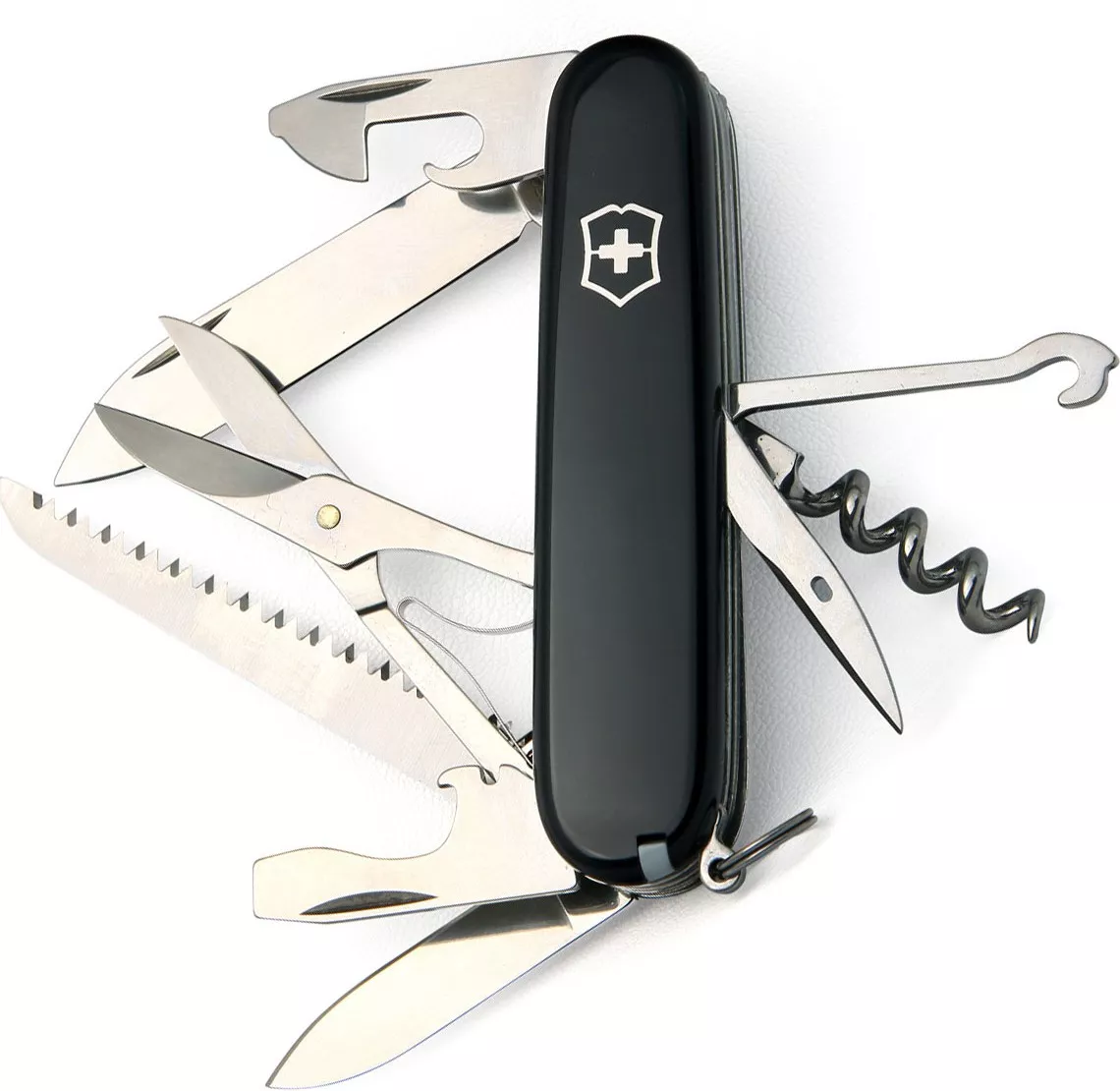 Швейцарский офицерский нож VICTORINOX Swiss Army Huntsman (1.3713.3)- универсальный помощник в городе, на рыбалке в походе. Имеется шило с ушком, им можно прошивать грубые материалы: кожу, брезент и др. Стандартным для ножей этой марки является наличие 2 открывалок с отвертками на торцах, штопора, пинцета и зубочистки (в отдельных пазах) и кольца для подвеса к поясу, связке ключей, карабину рюкзака. Набор необходимых инструментов рассчитан для 15 задач.