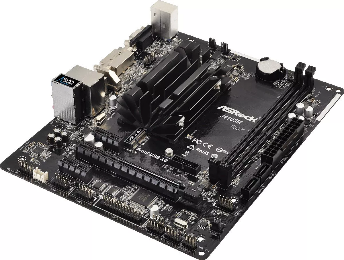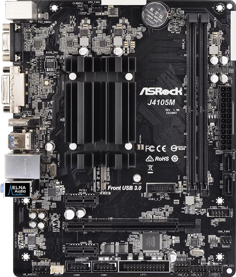 Проц: Intel Celeron Quad-Core J4105, 1.5 ГГц, Чипсет: Intel SOC, ОЗУ: DDR4 до 2400 МГц, Аудиосистема: Realtek® ALC887, 7.1, LAN: 10/100/1000 Мбит/с, Форм-фактор: Micro-ATX.