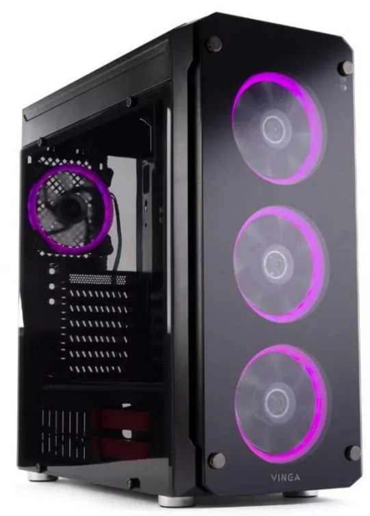 Системный блок этого компьютера собран в корпусе Vinga Gryphon, выполненном из материалов повышенной прочности. Он позволяет сконструировать достаточно мощный и при этом яркий игровой ПК. Конструкция собрана из коррозиестойкого листового металла и прозрачного ударопрочного пластика. Встроенные вентиляторы оснащены системой подсветки. При этом они не только очень красиво выглядят, но и эффективно выталкивают из корпуса нагретый воздух, тем самым заметно продлевая срок безаварийной работы всех устройств.