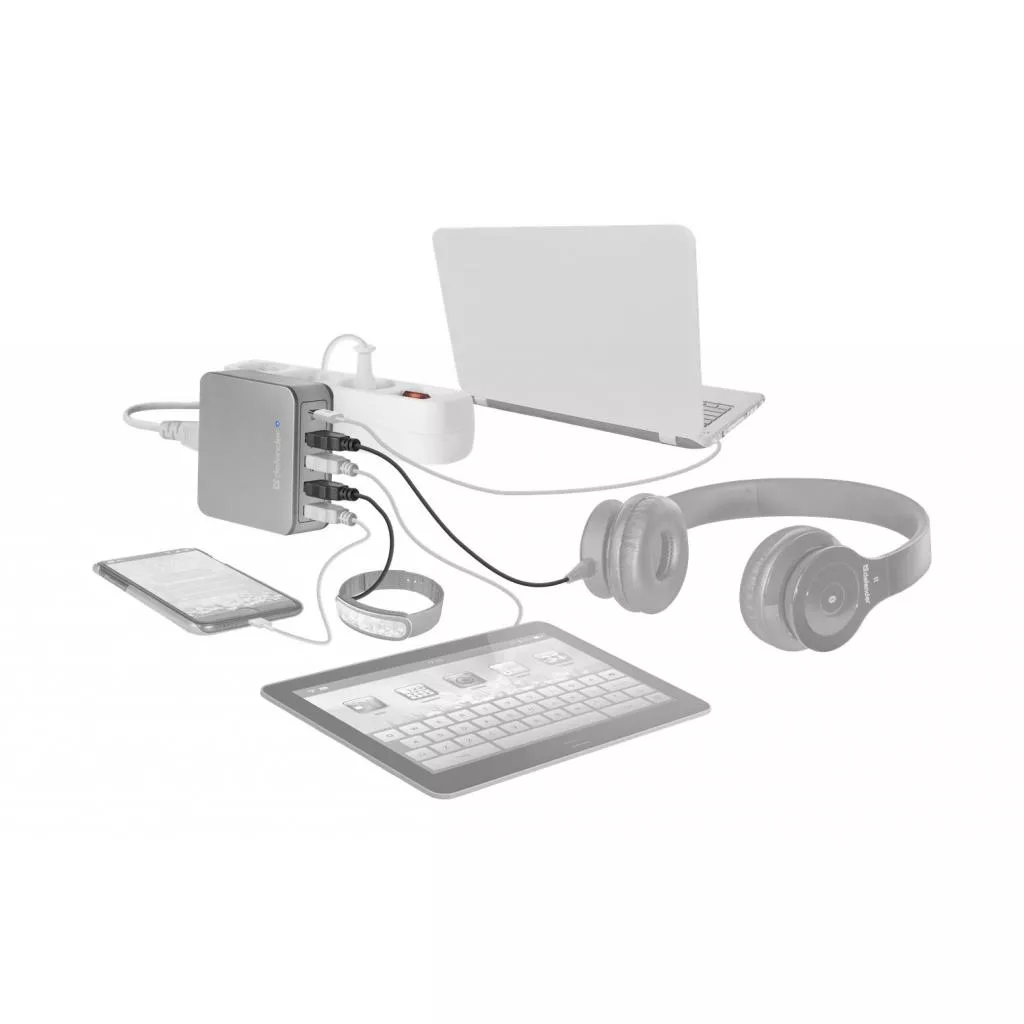 Тип - адаптер, входное подключение - сеть, назначение - для большинства устройств, питаемых постоянным током, совместимость - универсальный, тип выходного подключения - USB Type-C, USB, выходной ток - 8 А, количество USB портов - 4xUSB, Цвет - серебристый