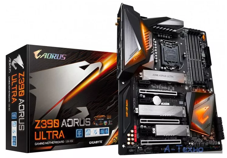 Системная плата AORUS Intel Z390 с 12-ти фазным цифровым модулем питания процессора, тепловой трубкой прямого контакта, технологией RGB Fusion, беспроводным сетевым контроллером 802.11ac, тремя разъёмами M.2 с радиаторами Thermal Guard, сетевым адартером Intel GbE LAN с поддержкой cFosSpeed, и c фронтальными и тыловыми портами USB 3.1 Gen 1 Type-C