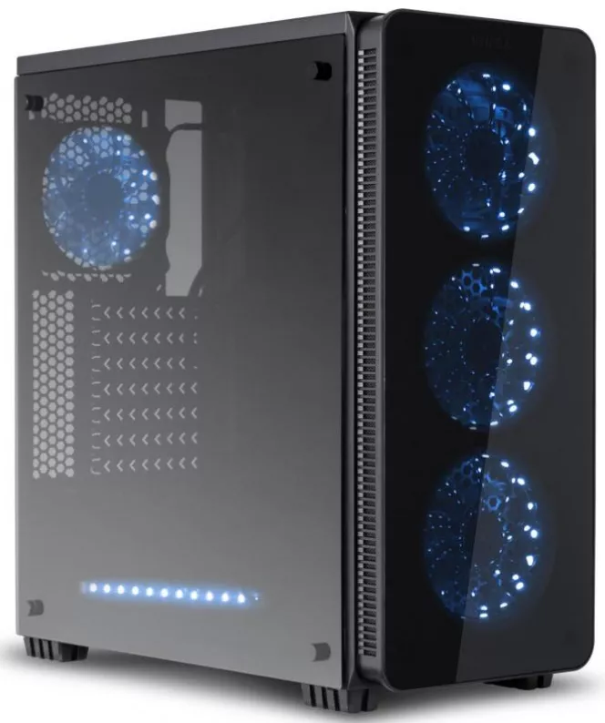 Системный блок этого компьютера собран в корпусе Vinga Hydra RGB, выполненном из материалов повышенной прочности. Он позволяет сконструировать достаточно мощный и при этом яркий игровой ПК. Конструкция собрана из коррозиестойкого листового металла и прозрачного ударопрочного пластика. Встроенные вентиляторы оснащены системой подсветки. При этом они не только очень красиво выглядят, но и эффективно выталкивают из корпуса нагретый воздух, тем самым заметно продлевая срок безаварийной работы всех устройств.