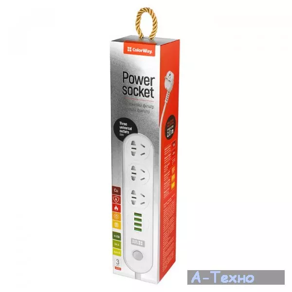 Сетевой фильтр-удлинитель СolorWay 3 розетки/4USB white - это удлинитель с тремя универсальными сетевыми розетками 220В и 4 USB портами 5В.