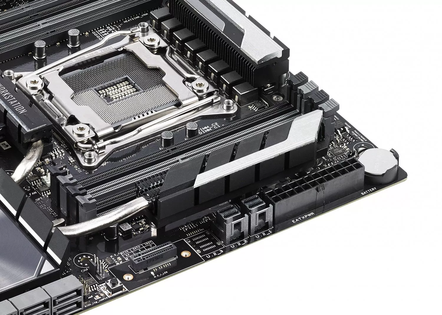 Мощная система питания, необходимая для современных процессоров Intel Core X-серии, требует соответствующего охлаждения, поэтому на компоненты стабилизатора напряжения установлен металлический радиатор со множеством ребер, которые увеличивают общую площадь теплорассеивания. Для еще большей эффективности этот радиатор соединен тепловой трубкой с дополнительным. Таким образом, материнская плата WS X299 Sage готова обеспечить стабильное питание процессора под любыми нагрузками.