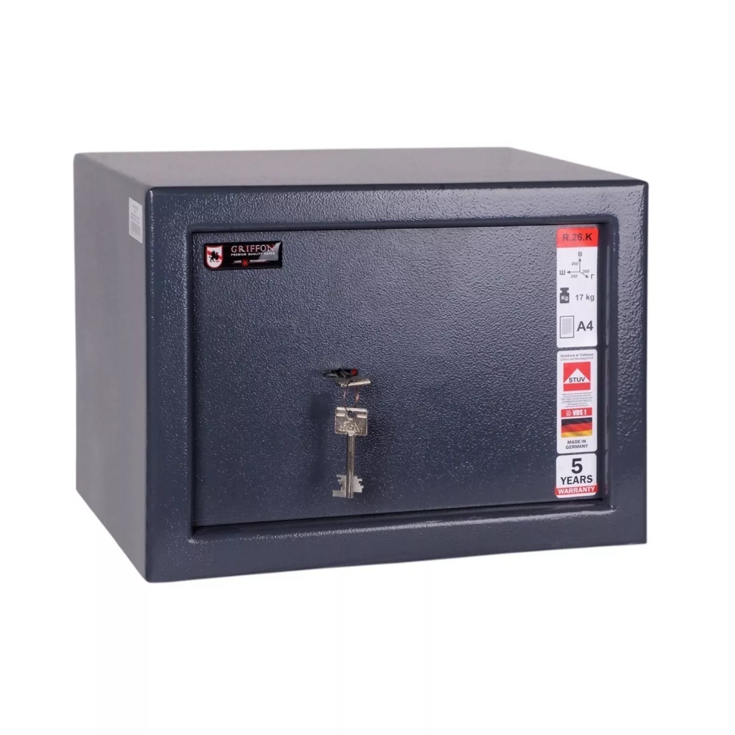 Сейф R.26.K обладает самой мощной в своем классе защитой. Корпус выполнен из 3 мм металла, дверь и притворная планка — из 6 мм металла. Закрывание обеспечивает надежный немецкий сейфовый замок с 25 мм ригелями.