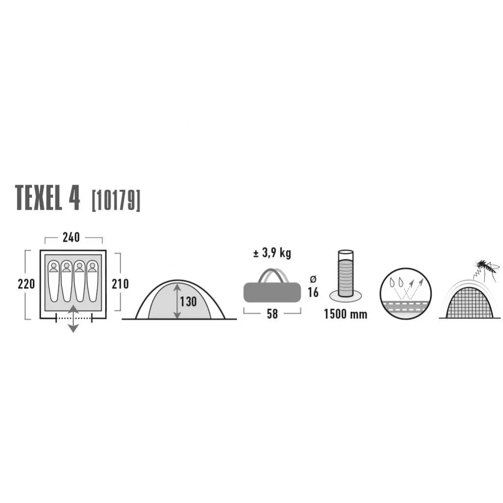 Двухслойная четырехместная купольная палатка High Peak Texel 4 легко устанавливается и подойдет для кемпинга на выходных. Широкое спальное место гарантирует комфортный сон после активного дня. Вентиляционный клапан и москитная сетка на входе обеспечат приток свежего воздуха и защиту от назойливых насекомых.