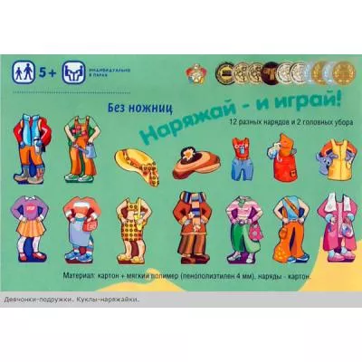 В игровой набор Умная бумага 2 куклы-наряжайки Подружки (136-02) входит две куклы из мягкого пенополиэтилена и картона, а также двенадцать цветных нарядов. Еще в комплекте есть двенадцать нарядов, которые можно раскрасить. Вам не понадобятся ножницы. Здесь Вы найдете подставки для кукол. А одежки можно надеть с помощью удобных креплений. Можно не только нарядить куколку в множество разнообразных нарядов, но и раскрасить новые наряды на свой вкус!