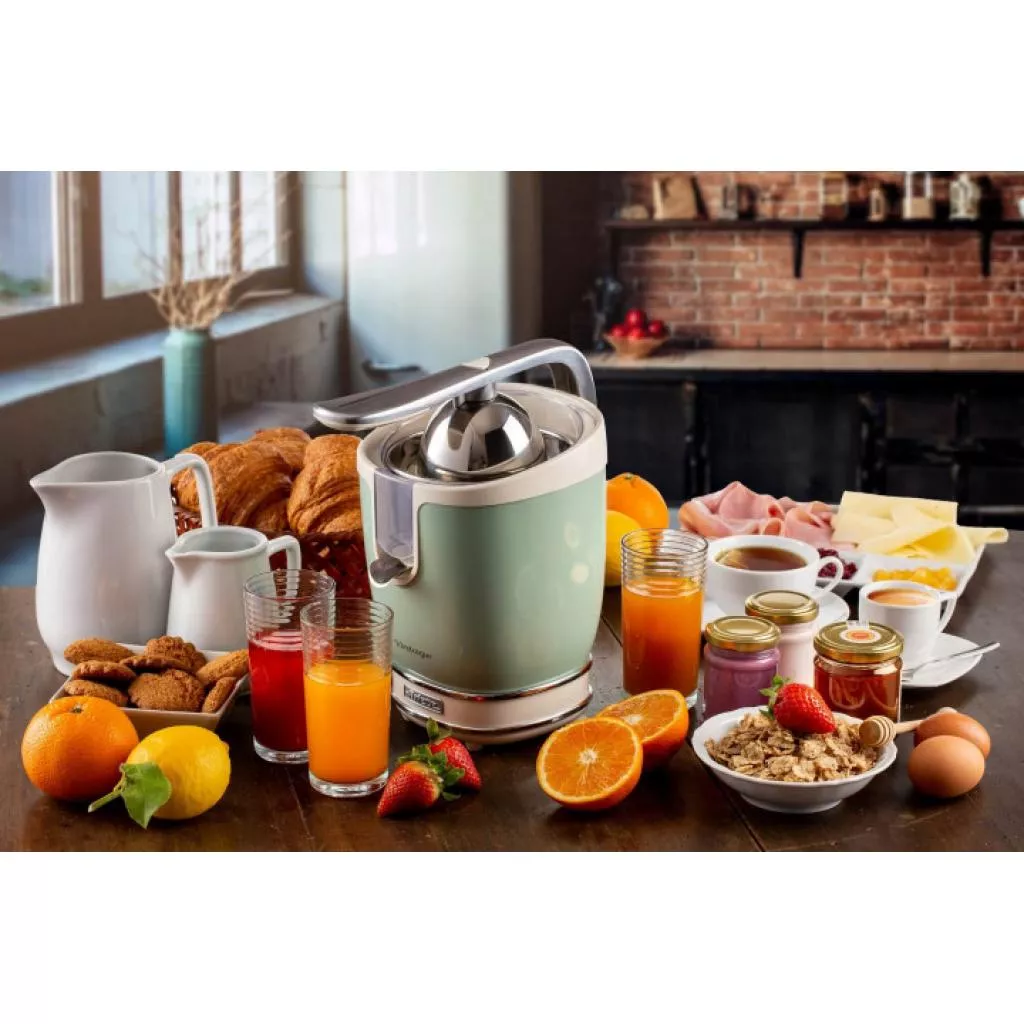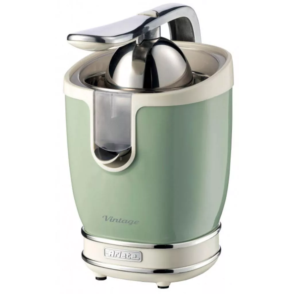 Апельсиновый сок на завтрак идеально подходит для наполнения витамином С, минеральными солями и энергией. С электрической соковыжималкой Ariete Vintage у вас будет мощная и производительная и бесшумная соковыжималка, которая одновременно придаст вашей кухне стиль ретро, типичный для линии Ariete Vintage Line, с прочным металлическим корпусом и хромированной отделкой. В комплекте 2 конуса для больших и маленьких фруктов: большой конус из нержавеющей стали и маленький конус, снабженный штифтом для удобной фиксации даже самых маленьких фруктов. Старинная цитрусовая соковыжималка оснащен и укомплектована рычагом давления, чтобы легко раздавить плод, обеспечивая сжатие до последней капли.