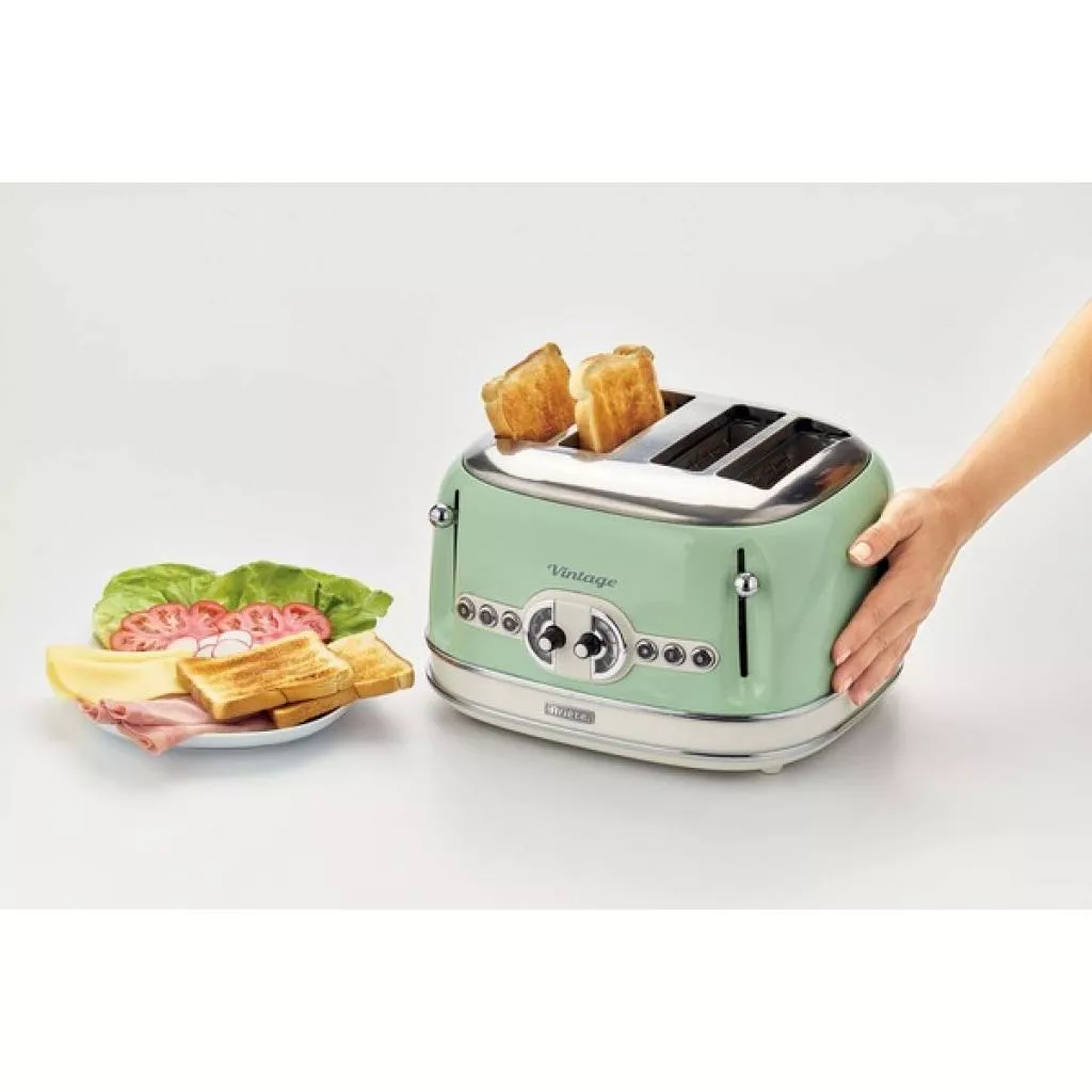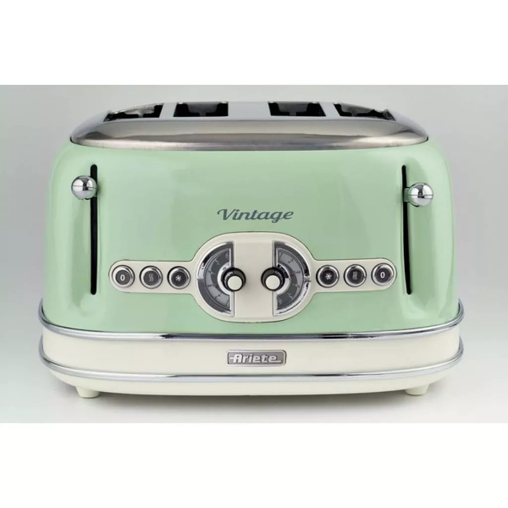 Выполненный в стильном ретро-дизайне тостер 156 серии (модельного ряда) Vintage от итальянской компании Ariete — это производительный тостер мощностью 1600 Вт. Особенностью рассматриваемой модели является возможность одновременного поджаривания четырех ломтиков хлеба, при этом степень прожарки регулируется по схеме 2 х 2.