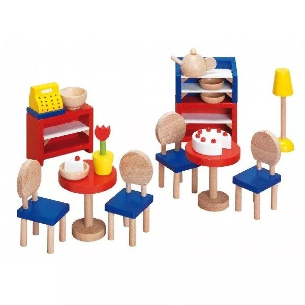 Набір «Меблі для бістро» від німецького виробника іграшок goki допоможе дітлахам оздобити їх ляльковий будиночок. Іграшкові меблі зроблять гру більш реалістичною, розширять світогляд, познайомлять із предметами побуту. Дівчата зможуть проявити свої дизайнерські здібності, розставляючи: полички, столи та стільці, посуд та інші предмети інтер’єру у відповідні місця. Німецький бренд goki пропонує також різноманітні набори меблів для вітальні, дитячої, кухні, садові меблі тощо. Для дітей від 3-х років.