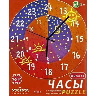 Соединения деталей продуманы и просчитаны с такой точностью, что при правильной сборке с моделью можно играть, как с обычной игрушкой. Пазл Умная бумага Часы День и ночь (126-06) -настоящие работающие часы, которые можно собрать своими руками. Это очень хороший сувенир и подарок. Собираем пазл, наклеиваем на него жесткую основу из картона (на нем есть липкий слой), вставляем механизм с батарейкой.