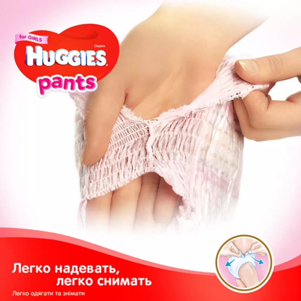 Трусики-подгузники Huggies Pants для девочек/для мальчиков разработаны с учитыванием анатомических особенностей специально для девочек/для мальчиков. Поясок и широкие боковинки тянутся во всех направлениях, эластичные манжеты вокруг ножек предназначены для более плотного прилегания и необходимого комфорта в движении. Вы сможете быстро и легко их надеть на кроху - как обычные трусики. И так же легко снять - необходимо просто разорвать боковинки. Индикатор влаги подскажет, когда пора менять трусики.