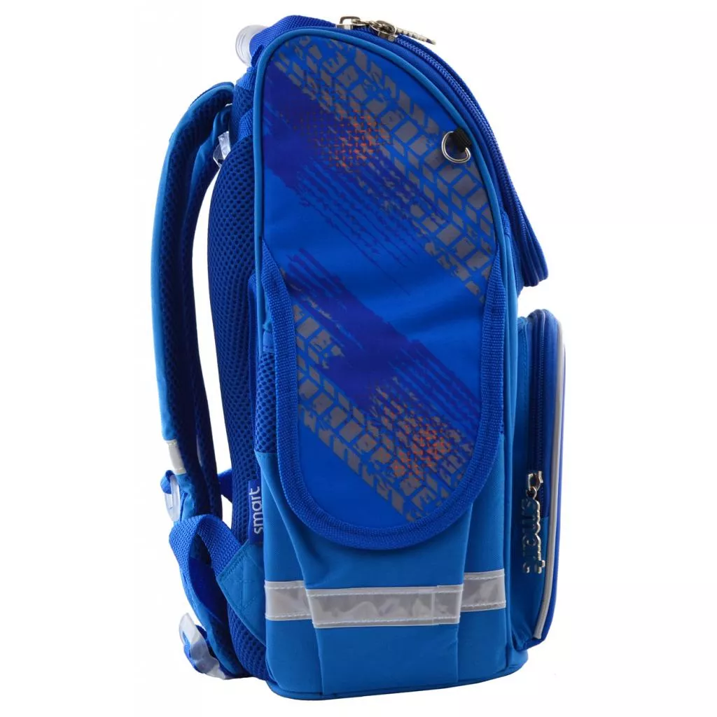 Школьный рюкзак Smart для девочек и мальчиков младшей школы. Выполнен из плотного и прочного материала – полиэстера. Дополнительно короб усилен вставками под подкладкой, которые сохраняют форму даже при давлении или неравномерных нагрузках. Эргономичная спинка с одной стороны твердая, а с другой – оснащен и укомплектована мягкими подушечками анатомической формы. Именно они защищают позвоночник от перегрузки. Вся задняя панель прошита сетчатым материалом для улучшенной вентиляции, как и лямки. Внутри рюкзака основной блок с разделителем для учебников, резинка для тетрадей. На передней панели небольшой кармашек для мелочей. По бокам два кармана на резинке для бутылочки с водой