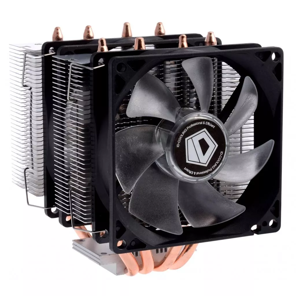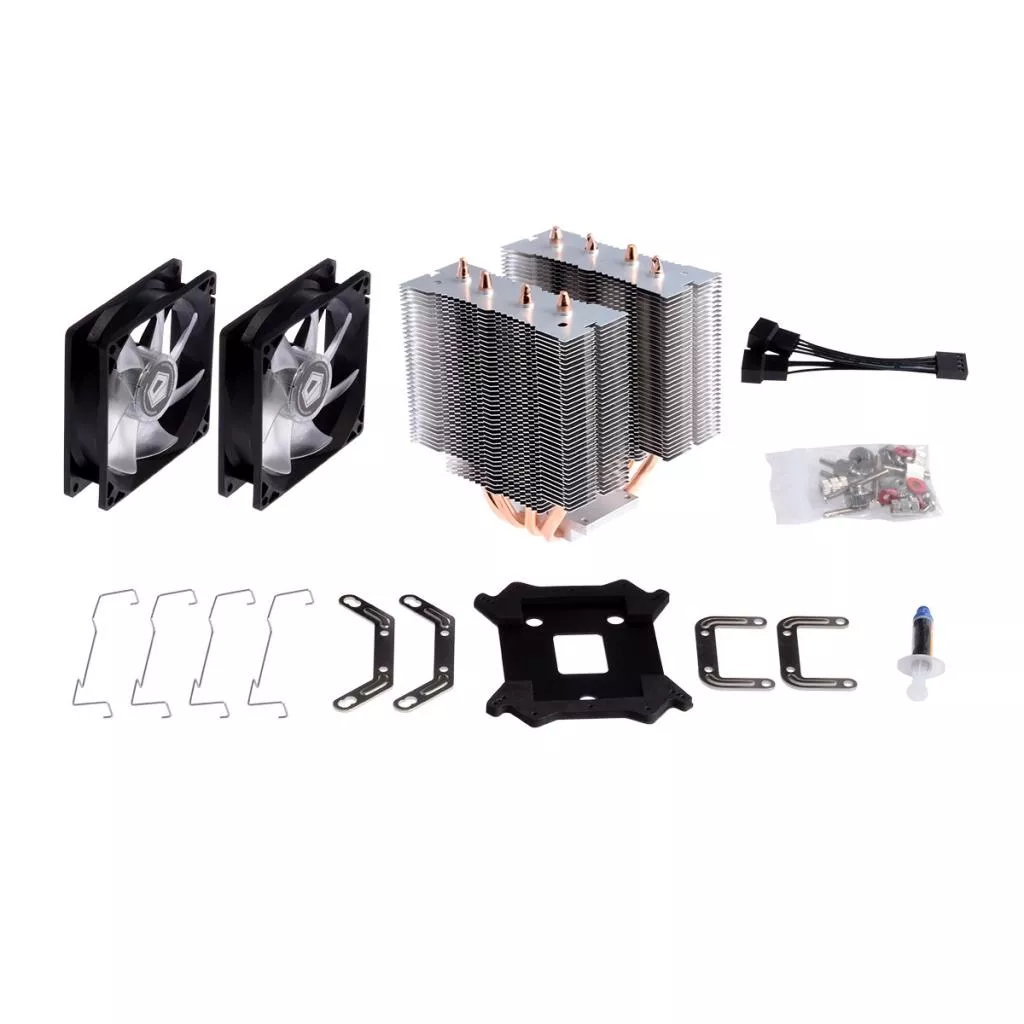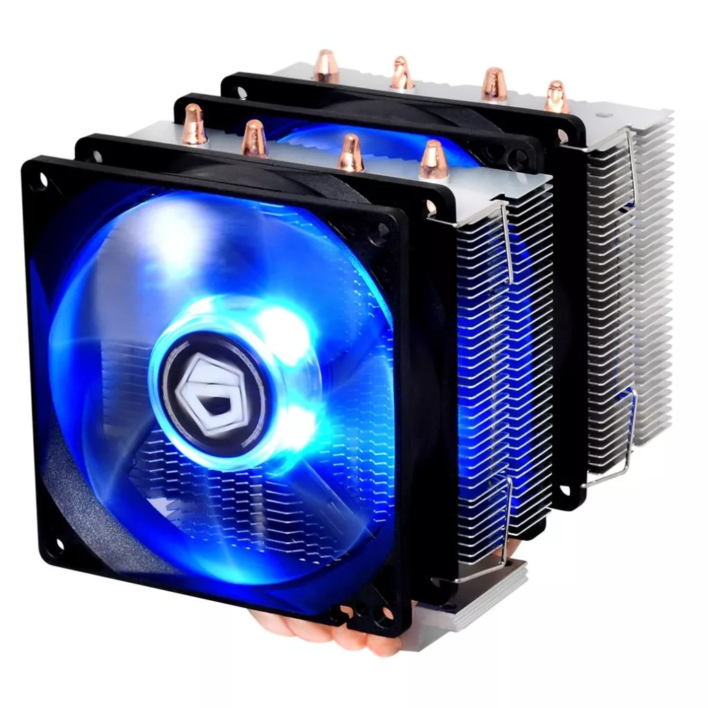 Кулер ID-COOLING SE-904TWIN Blue LED имеет 4 медные тепловые трубки диаметром 6 мм, непосредственно контактирующие с процессором. По ним тепло отводится к двум радиаторам по 40 алюминиевых пластин каждый. На радиаторах закреплены 92-миллиметровые вентиляторы с гидравлическими подшипниками. Каждый из двух вентиляторов с синей светодиодной подсветкой вращается со скоростью до 2200 об/мин.
