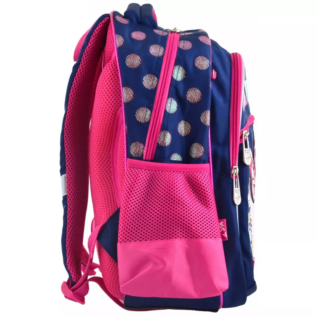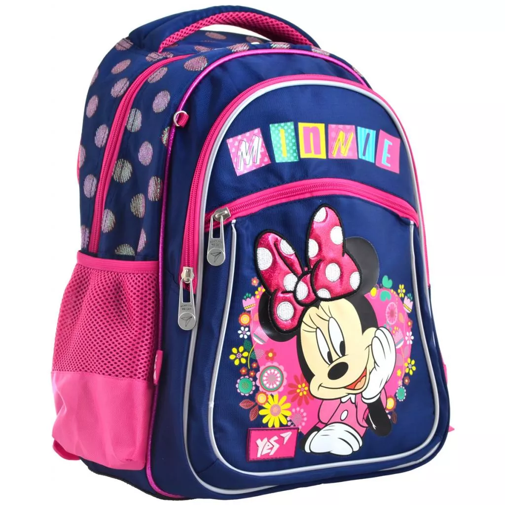 Детский школьный рюкзак "Minnie" на два отделения. На передней панели - один карман на молнии, боковые карманы для воды. Внутри - дополнительные разделители и эластичный фиксатор. Плотная спинка с вентилируемой сеткой «Air Mesh» и комфортные лямки. Для безопасности ребенка в темное время суток — наличие светоотражающих элементов. Основной материал: полиэстер водоотталкивающий.