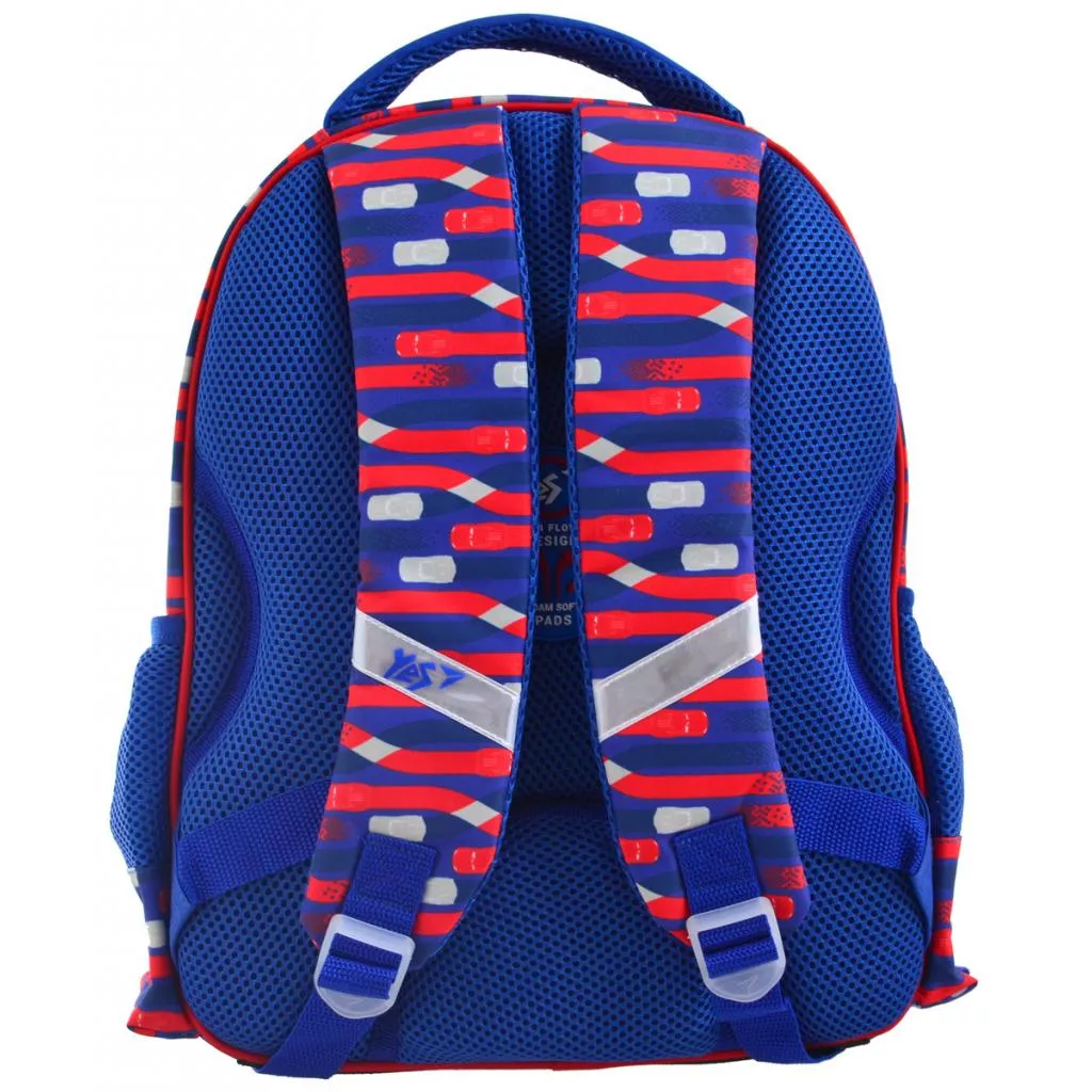 Детский школьный рюкзак "Cars" на два отделения. На передней панели - один карман на молнии, боковые карманы для воды. Внутри - дополнительные разделители и эластичный фиксатор. Плотная спинка с вентилируемой сеткой «Air Mesh» и комфортные лямки. Для безопасности ребенка в темное время суток — наличие светоотражающих элементов. Основной материал: полиэстер водоотталкивающий.