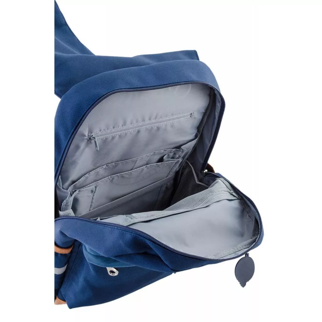 В рюкзаке - подвижные разделители с эластичной лентой, два кармана на молнии, карманы на липучке, карман для мобильного телефона, внутренний боковой карман. На передней панели - один карман на молнии. Боковые карманы с обеих сторон. Плотная спинка с вентилируемой сеткой "Air Mesh" и с карманом на молнии. Наплечные эргономичные ремни с дышащей сеткой. Съемный поперечный ремень. Брендированная подкладка и прочная металлическая фурнитура. Светоотражающие элементы. Материал: полиэстер и синтетический нубук. габаритные размеры: 42х28х13 см. Объем (л): 10. Вес: 850 г.