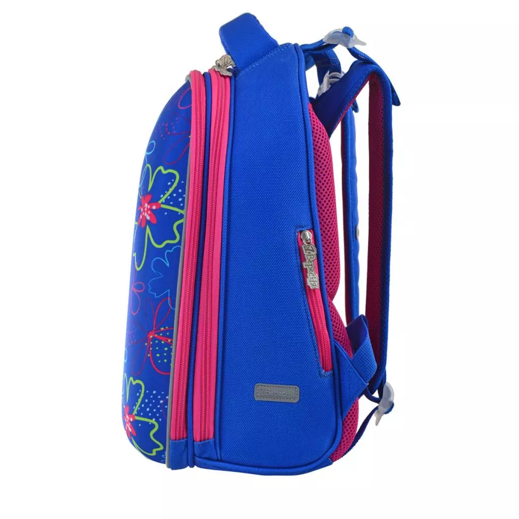 Плотный жесткокаркасный рюкзак на два отделения. Передняя панель выполнена в виде «панциря», который не деформируется при легком давлении, сохраняя форму даже при неравномерной загрузке рюкзака. «Панцирь» выполнен из плотного EVA-материала. Рюкзак повторяет форму позвоночника, препятствует его искривлению, способствует формированию правильной осанки. Уникальная система крепления лямок дает возможность выставить максимально и в полном объеме комфортную высоту по спине ребенка. Есть дополнительная фиксация лямок с помощью нагрудного ремня. 1 потайной карман с сеточкой для бутылки с водой и других личных вещей. Наличие отделения для лэптопа, органайзера, телефона. 6 светоотражающих элементов. Усиленное дно с защитными ножками.