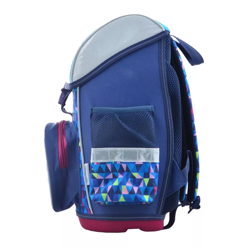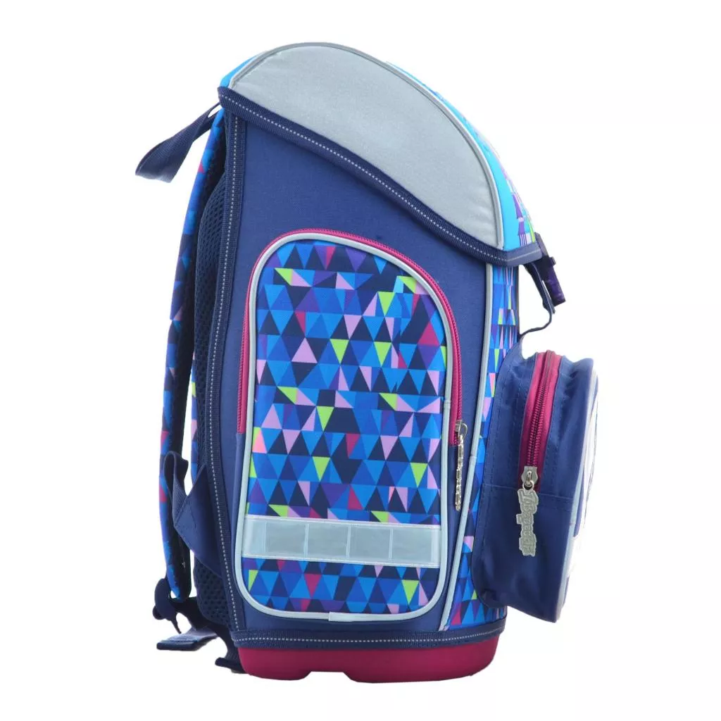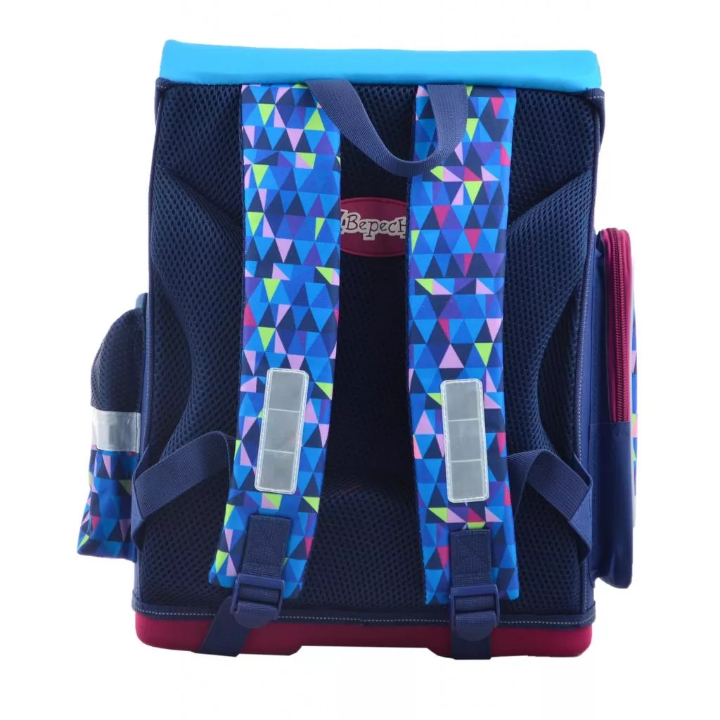 Каркасный рюкзак для учеников младших классов. Имеет одно основное отделение для принадлежностей и два боковых кармана - для мелочи и бутылки с водой. Дополнительно имеется секция для лэптопа и маленький кошелек. Ранец удобно держать в руке, легко подвешивать на крючок. Дно уплотнено плотной материей и специальной вставкой. Дополнительно: водонепроницаемая поверхность, 16 светоотражающих элементов. Основной материал: полиэстер. габаритные размеры: 30х40х16 см. Объем: 19 л. Вес: 1100 г.